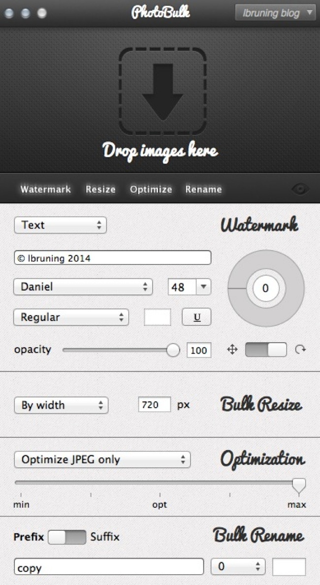PhotoBulk can be used on your Windows or MAC computer to watermark, resize, optimize and rename your images. $5 USD will upgrade you to Premium – which allows you to create templates and automate batches of images to improve the speed and accuracy of your photo-watermarking tasks.