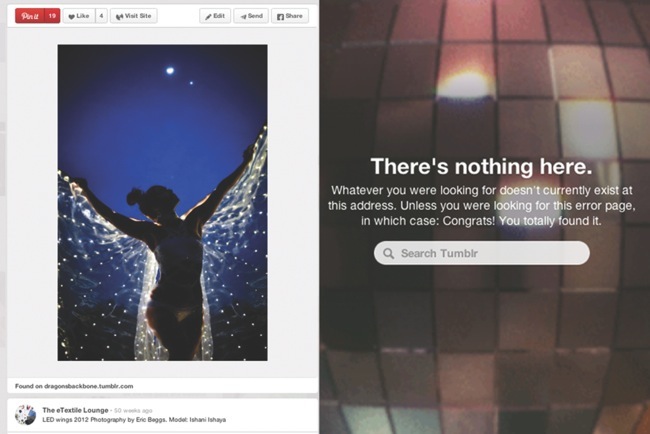 For example, how often have you clicked on a Pinterest image, only to find that the link is dead and there’s no way to track back to the author, artist or website of origin? (See an image of my work, above left, and the kind of dead end you can hit after clicking on an image without direct link or attribution, at right).