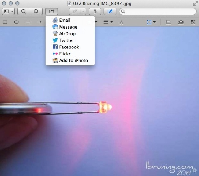 Once you’ve added your watermark via text box, you can immediately share your image via Facebook, Twitter, Flickr, or email by using the share icon in the tool bar, shown below.