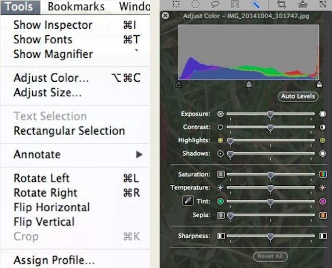 Click on TOOLS in the menu bar to access the drop-down; scroll down to “ANNOTATE” and then “TEXT” to make a text box appear on your image (drop down box shown below on left). TOOLS also allow adjustments to image color, size, rotation and selection of font and size (tools shown below on right).