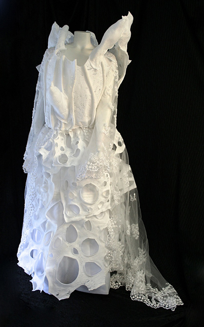 I steamed and melted Fosshape to create the birds and nest dress pieces and used a recycled wedding dress and lace overcoat on which I have also free-motion stitched a poem.