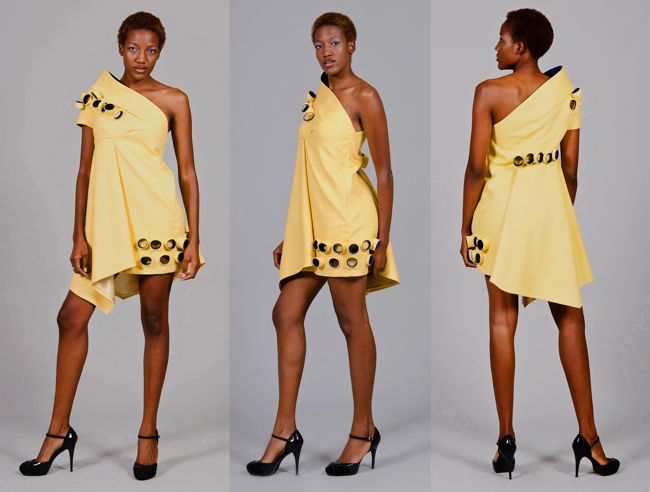 Anny Chang comments: Geometric shapes have been a major influence on my artwork; in this design, a cluster of paper towel rolls, cylindrical prisms, was the inspiration. To create a dress with the sculptural effect of paper towel rolls through draping technique was the purpose of the design.