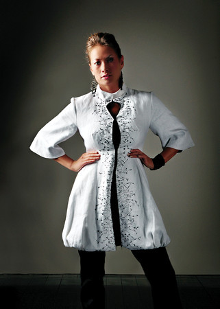 JB: This garment showed precise workmanship and concept. The simple but revealing title was evocative. Did Snow Day refer to a day off work that allowed the designer an unexpected block of time to express creativity? Or did it refer to the bright white fabric that billowed a bit as drifting snow does, with delicate black embroidery suggesting bird or small animal prints in the snow? I imagine both fed into the creation of the piece.
