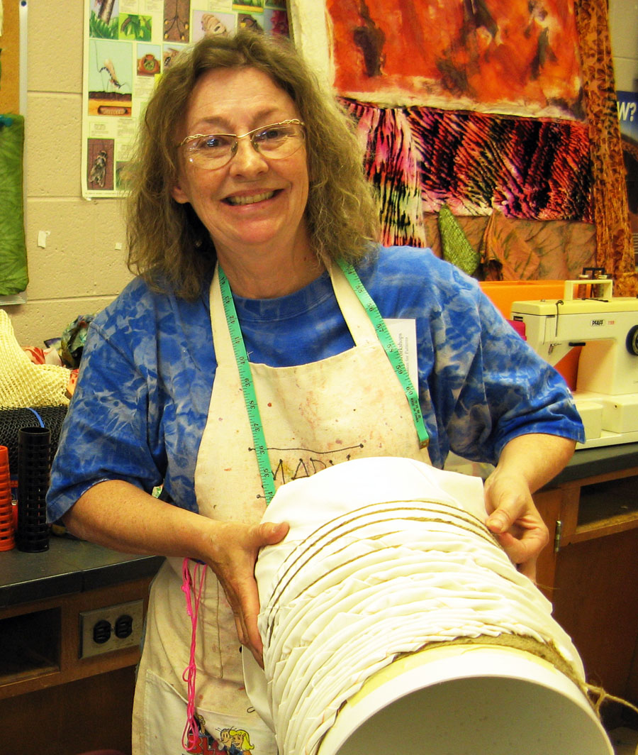 Though a fiber artist (and costumer designer) in technique and materials, she approaches her art more like an abstract painter, relying on improvisation and painterly techniques rather than the more precise, controlled approach traditionally favored by fiber artists.